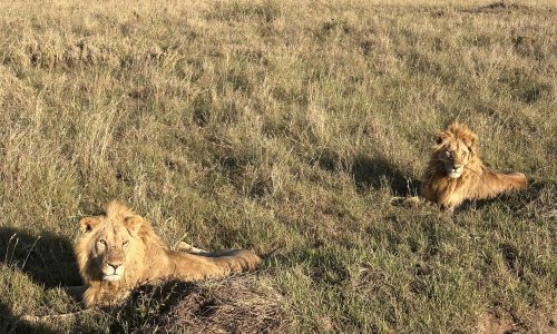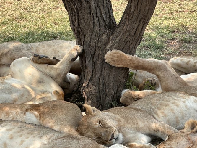 That afternoon, we continued to Singing Grass Camp, my home for the next two nights, where warm, unpretentious hospitality immediately set the tone. This is luxury with a clean, thoughtful design — a beautifully appointed tented camp with spacious rooms, indoor and outdoor showers, complemented by generous, well-prepared meals. The tents sit low to the ground with open views across the plains, creating a sense of calm and connection to the landscape. That night, lions called in the darkness — deep, resonant roars that seem to vibrate through your chest. At dawn, we watched two younger male lions being chased off by the dominant older male, a reminder of how power constantly shifts here.
